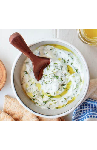 An authentic Greek dip of refreshing yoghurt blended with grated cucumber and garlic. Flavoured with olive oil, and mint.