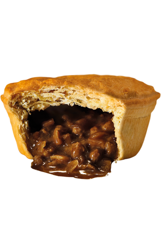 A ready baked round pie: Minced beef, chopped onions and dark gravy in a light puff pastry case.