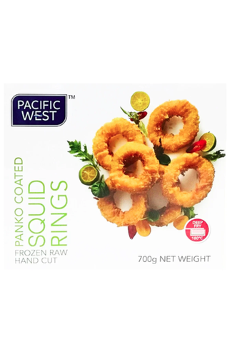 Raw, pre-fried squid rings coated in panko breadcrumbs