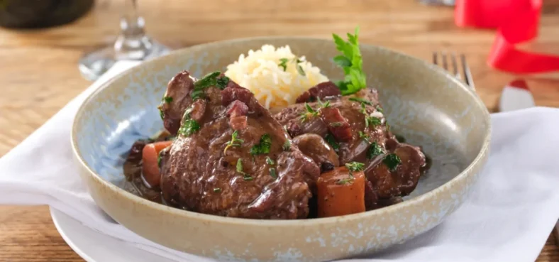 - In the same pan add, shallots, and soften for a few minutes, add the wine and chicken stock, bring to the boil, and add the chicken, carrots, bouquet garnie, garlic powder, tomato paste and cooked bacon. Add mushrooms, stir and allow to simmer for about 1 minute.